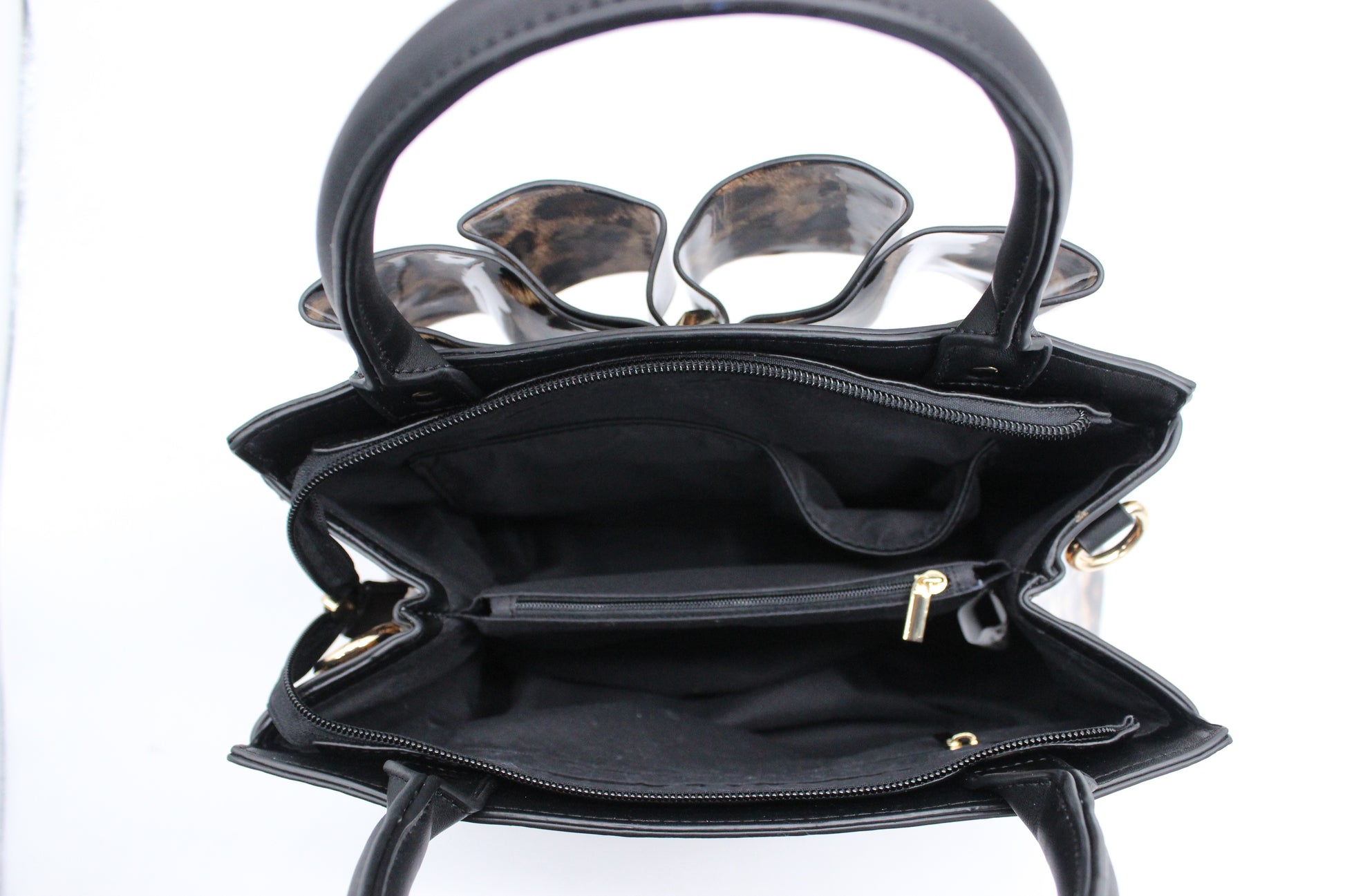 Make a bold fashion statement with this leopard print handbag featuring an oversized decorative bow. Its structured design offers multiple compartments for organized storage, while the secure zip closure keeps essentials protected. Comfortable top handles provide easy carrying, and the roomy interior makes it perfect for work, outings, or special occasions. A chic and eye-catching bag that adds flair to any outfit.